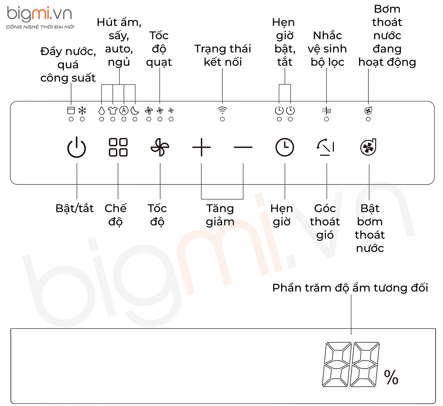- Duy trì độ ẩm tự động: Tự động điều chỉnh để giữ độ ẩm trong phòng ở mức bạn mong muốn, từ 40-70%RH.