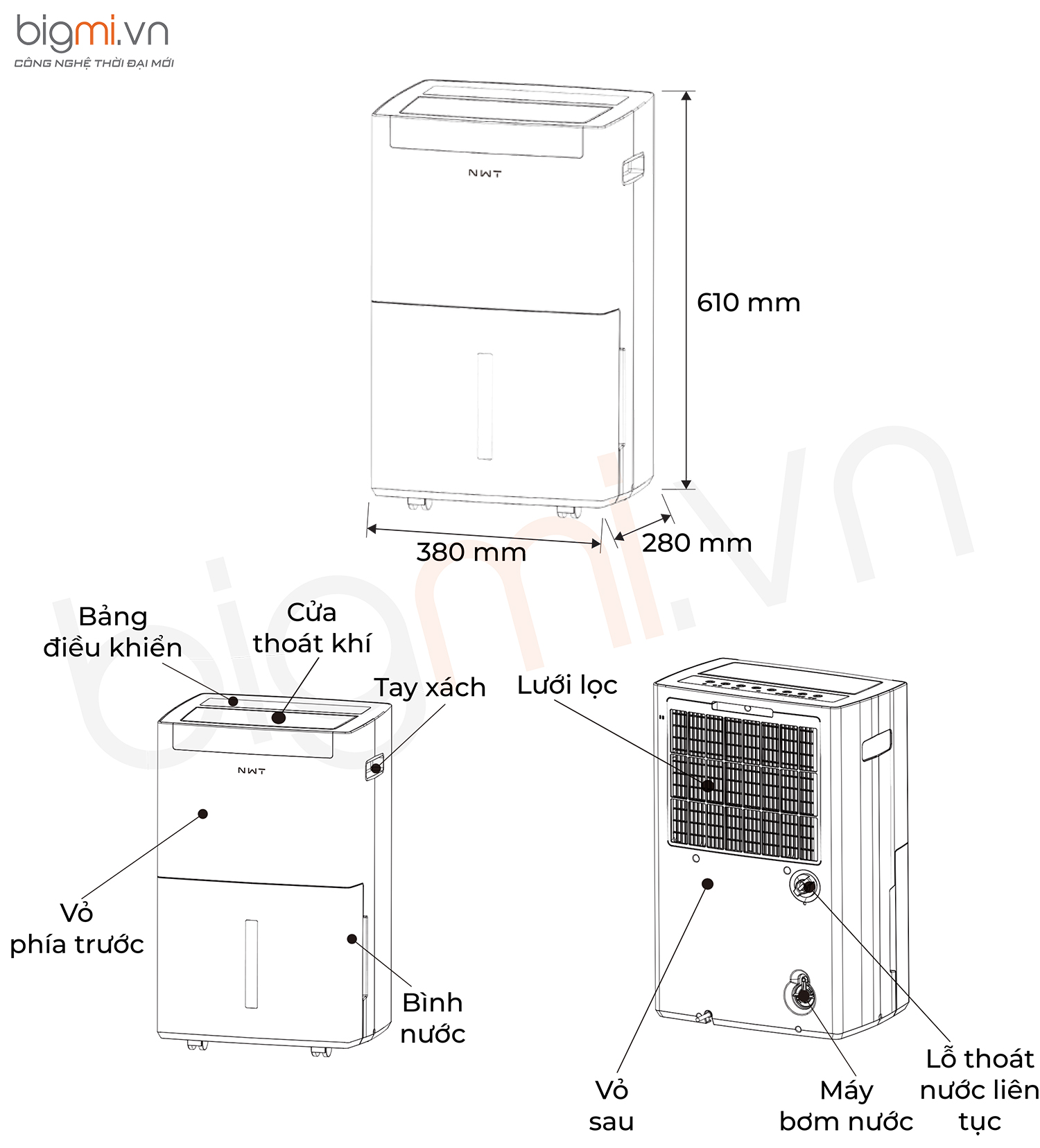 - Hệ thống thoát nước kép: Có thể dùng bình chứa tích hợp hoặc lắp thêm ống xả nước liên tục ra ngoài.