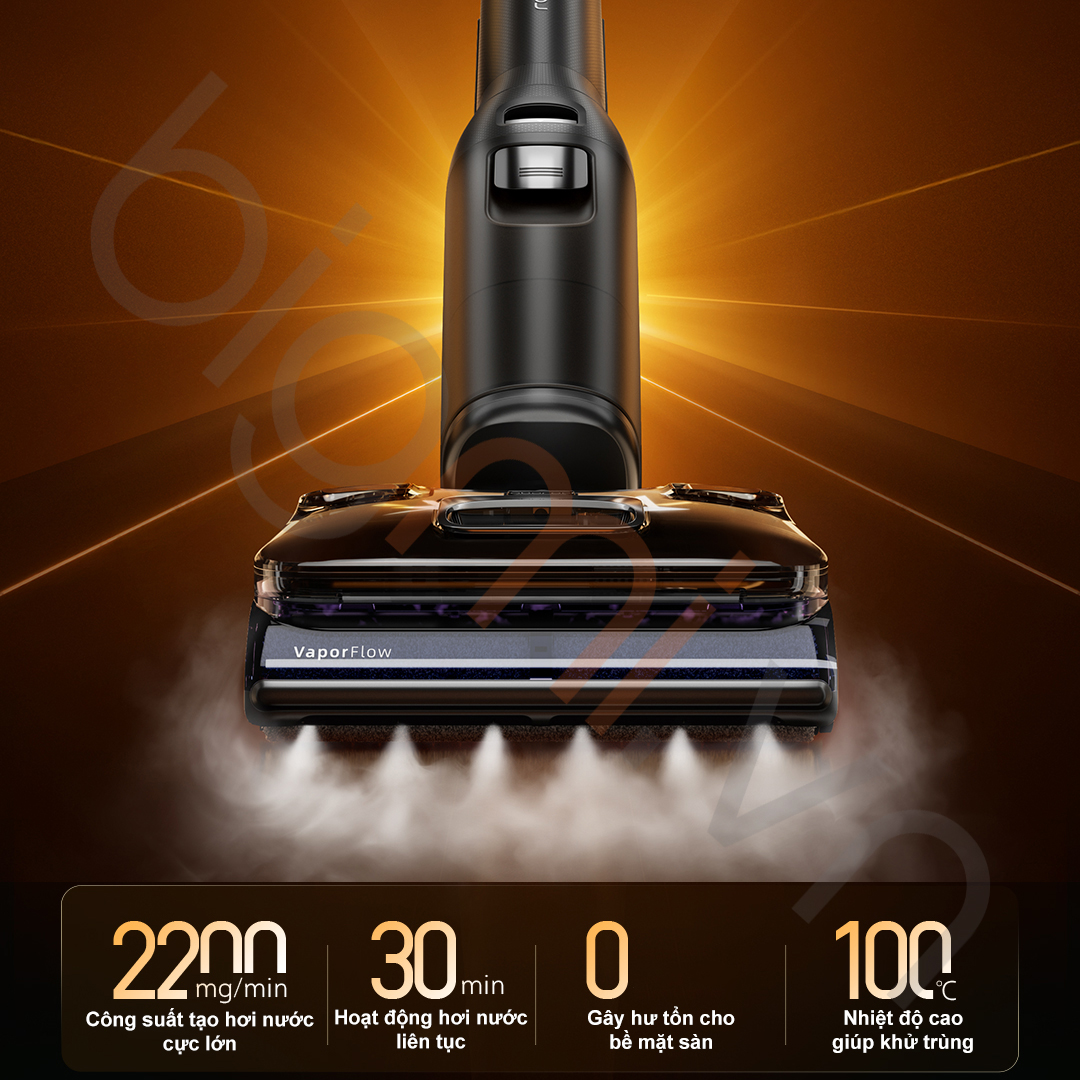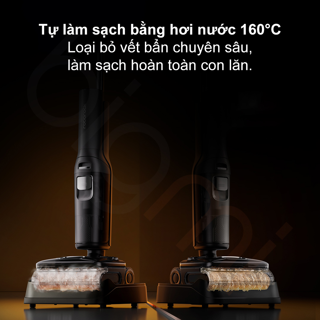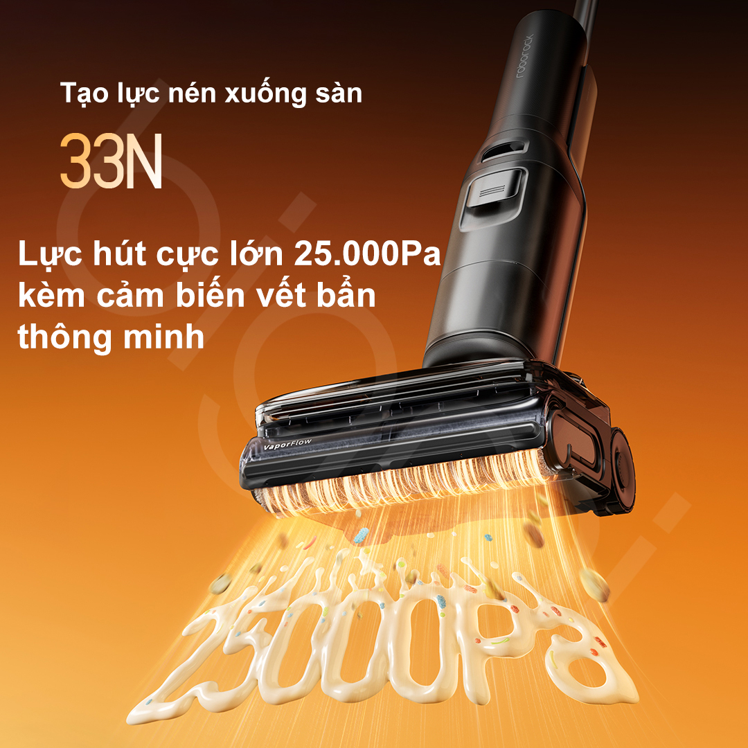 Bên cạnh hơi nước, F25 Ultra Combo còn tiên phong tích hợp hệ thống rửa sàn bằng nước nóng 86°C. Nước được đun nóng tức thì và phun qua 32 lỗ phân bổ 360 độ quanh con lăn. Kết hợp với công nghệ WaveFlow® chuyên biệt, máy có khả năng đánh bay các vết dầu mỡ cứng đầu trong nhà bếp như dầu lẩu, sốt cà chua hay dầu lạc nhanh gấp 5 lần so với nước lạnh, giúp sàn nhà sạch bong và khô thoáng, không còn cảm giác bết dính. Lượng hơi nước Roborock F25 Ultra Combo phun ra đạt mức 2200mg/phút, cho phép máy hoạt động liên tục trong 30 phút ở chế độ hơi nước, đủ để làm sạch sâu mọi khe kẽ trong những không gian rộng lớn.