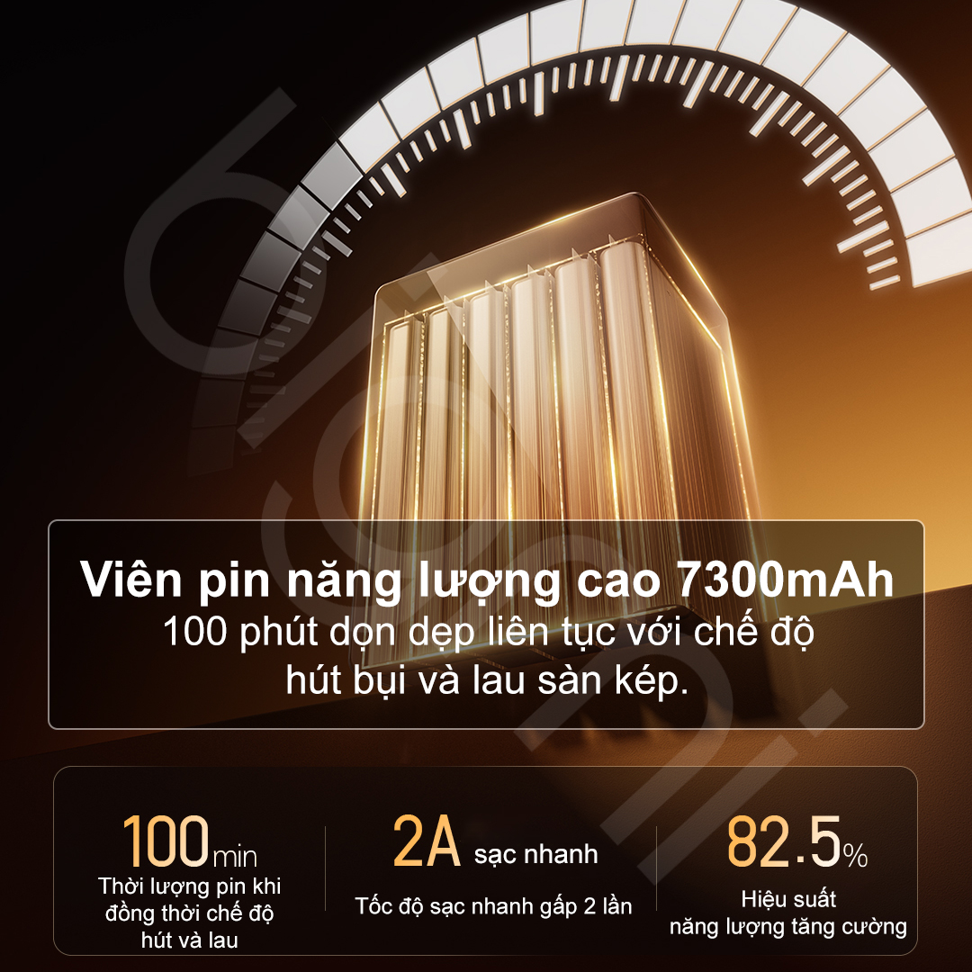 Để duy trì hiệu suất mạnh mẽ này, thiết bị được trang bị thế hệ pin túi (Pouch Cell) mới nhất với dung lượng 7300mAh. Loại pin này có mật độ năng lượng cao hơn 82.5% so với pin lithium-ion truyền thống, giúp máy hoạt động liên tục 100 phút ở cả chế độ lau và hút. Với một lần sạc, F25 Ultra Combo có thể làm sạch diện tích lên tới 450m², đáp ứng hoàn hảo cho các căn biệt thự hoặc căn hộ thông tầng.Hệ thống quản lý năng lượng AI Health Management cũng được tích hợp để giám sát dòng điện và nhiệt độ, bảo vệ pin khỏi chai lỳ qua hàng nghìn chu kỳ sạc.