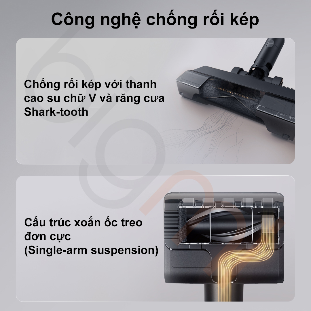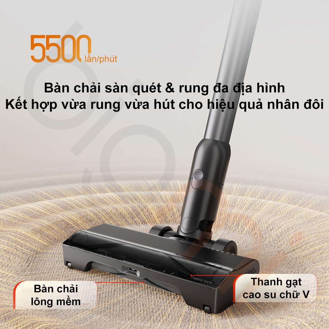 Đối với những ngôi nhà sử dụng nhiều thảm, F25 Ultra Combo cung cấp bàn chải quét sàn đa địa hình với thiết kế chữ V độc đáo,. Bàn chải này kết hợp giữa các sợi lông mềm để lau sàn cứng và các thanh cao su đàn hồi để đập cơ học vào bề mặt thảm với tần suất 5500 lần/phút,. Lực đập mạnh mẽ này sẽ đẩy các hạt bụi và rác sâu trong kẽ thảm ra ngoài để lực hút 25000Pa dễ dàng thu hồi,. Thiết kế chữ V cũng đóng vai trò quan trọng trong việc dẫn hướng tóc và rác vào trung tâm họng hút, tăng cường khả năng chống quấn.