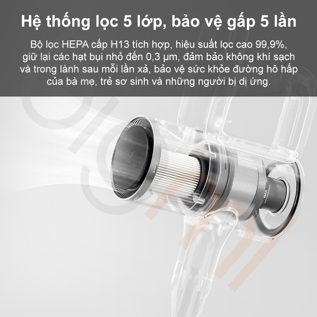 - Hệ thống lọc bụi 5 lớp và HEPA H13.