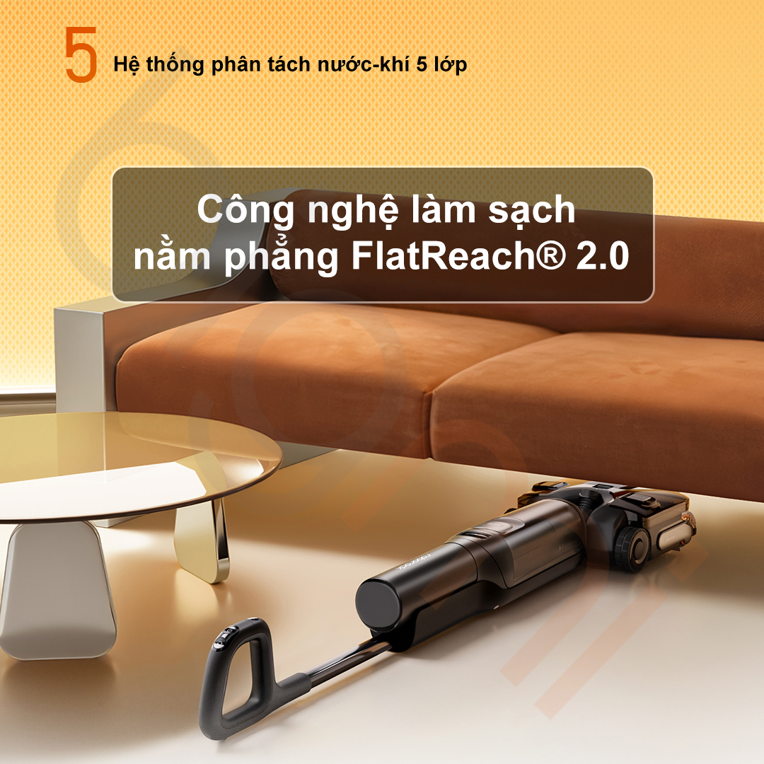 Đặc biệt, công nghệ FlatReach 2.0 trên F25 Ultra Combo cho phép thân máy nằm phẳng hoàn toàn 180 độ với độ dày chỉ 12.5cm. Điều này giải quyết triệt để vấn đề làm sạch gầm giường, gầm sofa thấp mà các máy truyền thống phải “bó tay”. Ngay cả khi nằm phẳng, hệ thống tách nước và khí 5 lớp của F25 Ultra Combo vẫn hoạt động hiệu quả để ngăn nước tràn vào động cơ, duy trì lực hút mạnh mẽ. Người dùng thậm chí có thể điều khiển máy tiến lùi qua ứng dụng điện thoại như một chiếc xe điều khiển từ xa để vệ sinh những góc khuất tầm nhìn.