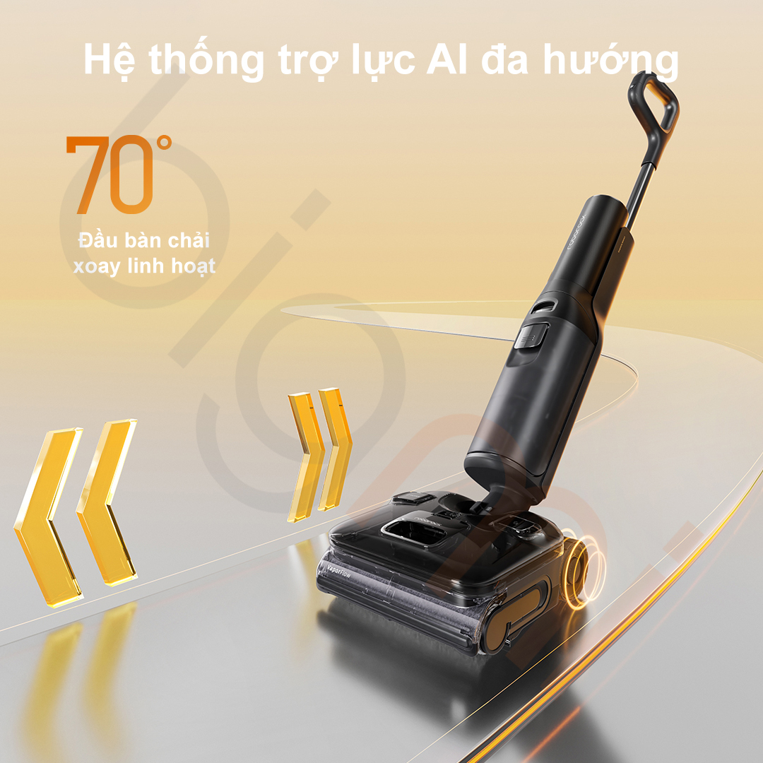 Việc di chuyển một thiết bị làm sạch chưa bao giờ nhẹ nhàng đến thế nhờ hệ thống động cơ bánh xe trực tiếp (Hub Motor) và thuật toán trợ lực AI trên Roborock F25 Ultra Combo. Cảm biến sẽ nhận diện ý định di chuyển của người dùng với tần suất 500 lần/giây để điều phối lực hỗ trợ, giúp việc đẩy, kéo hay xoay máy trở nên mượt mà như trong môi trường “không trọng lực”. Đầu bàn chải F25 Ultra Combo cũng có khả năng xoay linh hoạt 70 độ, giúp luồn lách dễ dàng qua các chân bàn ghế.