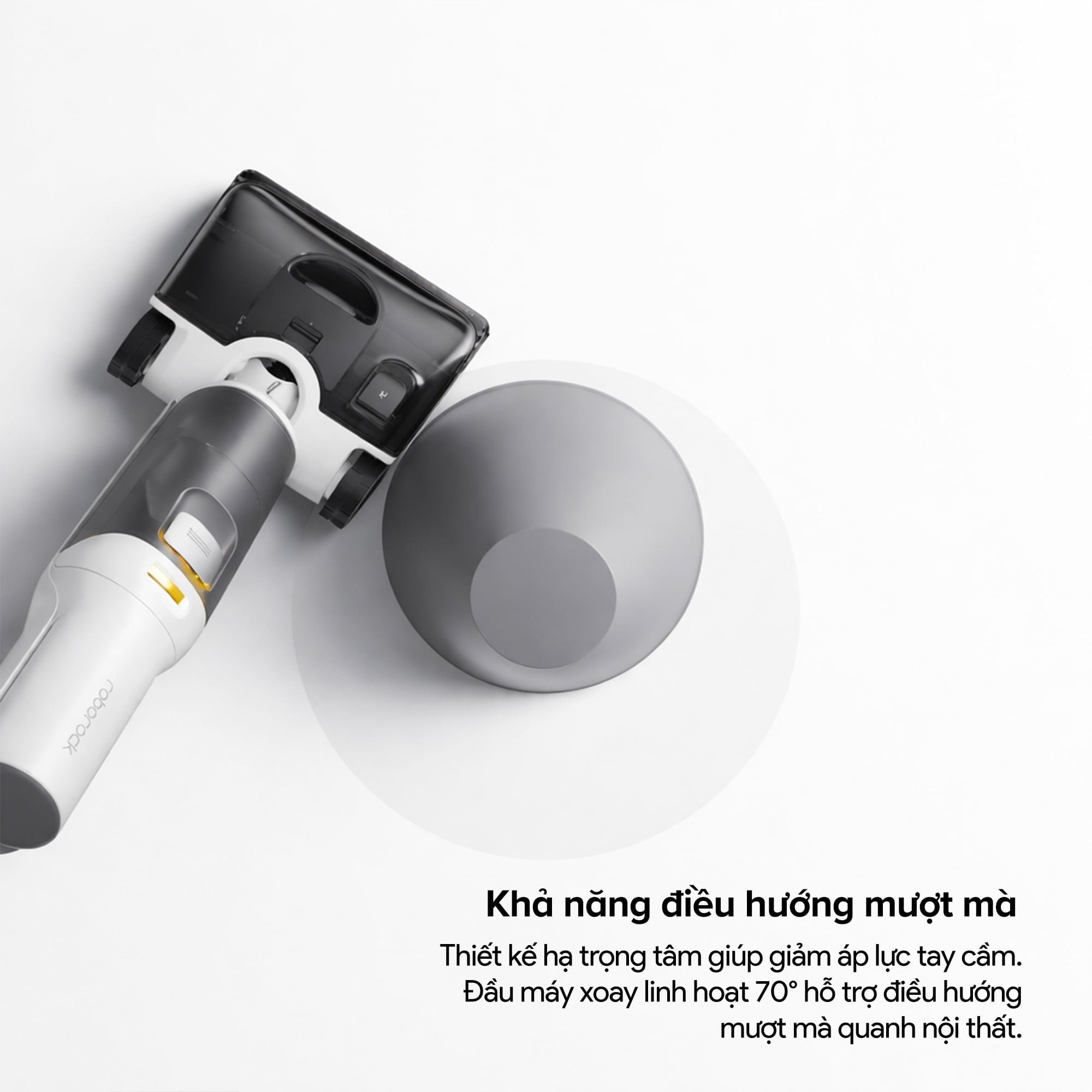 Roborock F25 RT Gen 2 được thiết kế với trọng tâm thấp, giúp giảm áp lực lên tay cầm trong suốt quá trình sử dụng. Đầu máy có khả năng xoay linh hoạt lên đến 70°, hỗ trợ người dùng điều hướng dễ dàng quanh các vật cản và nội thất trong nhà. Thiết kế này đặc biệt hữu ích khi làm sạch quanh chân bàn, chân ghế hay các góc cạnh của phòng, mang lại trải nghiệm vận hành nhẹ nhàng và linh hoạt hơn so với các dòng máy thông thường.
