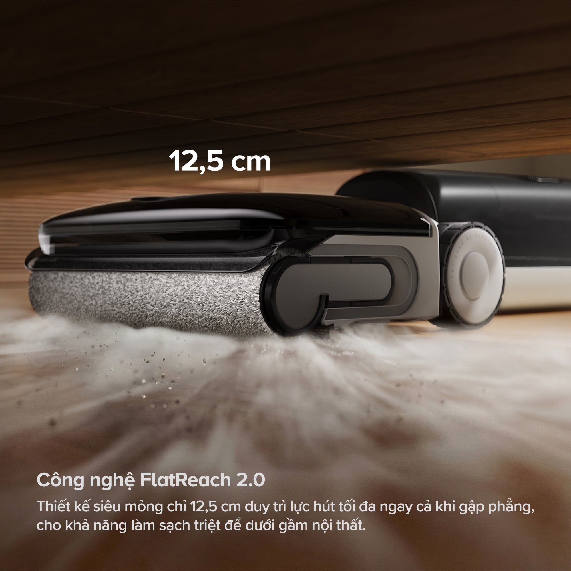 Một thách thức phổ biến với các thiết bị làm sạch thông thường là không thể tiếp cận những khu vực hẹp dưới gầm giường, gầm sofa hay tủ thấp. Máy hút bụi lau sàn cầm tay Roborock F25 RT Gen 2 giải quyết vấn đề này hoàn toàn nhờ công nghệ FlatReach 2.0 với thiết kế siêu mỏng chỉ 12,5 cm. Cấu trúc này cho phép F25 RT Gen 2 duy trì lực hút tối đa ngay cả khi gặp phẳng hoàn toàn, đảm bảo làm sạch triệt để mọi góc khuất dưới gầm nội thất mà không cần tháo dời hay di chuyển đồ đạc.