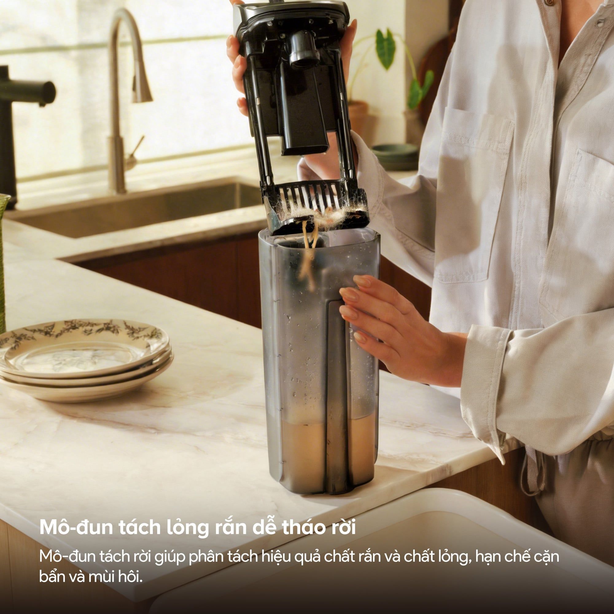 Quản lý nước bẩn sau làm sạch là một khía cạnh thường bị bỏ qua nhưng lại ảnh hưởng trực tiếp đến vệ sinh thiết bị và chất lượng sử dụng lâu dài. Máy hút bụi lau sàn cầm tay Roborock F25 RT Gen 2 được trang bị mô-đun tách lỏng rắn có thể tháo rời dễ dàng. Hệ thống này phân tách hiệu quả chất rắn và chất lỏng trong nước bẩn, hạn chế tình trạng cặn bẩn tích tụ và mùi hôi phát sinh từ bình chứa nước thải. Cơ chế tháo lắp đơn giản giúp quá trình làm sạch bình chứa sau mỗi lần sử dụng trở nên nhanh chóng và thuận tiện hơn, đảm bảo thiết bị luôn trong trạng thái vệ sinh tốt nhất.