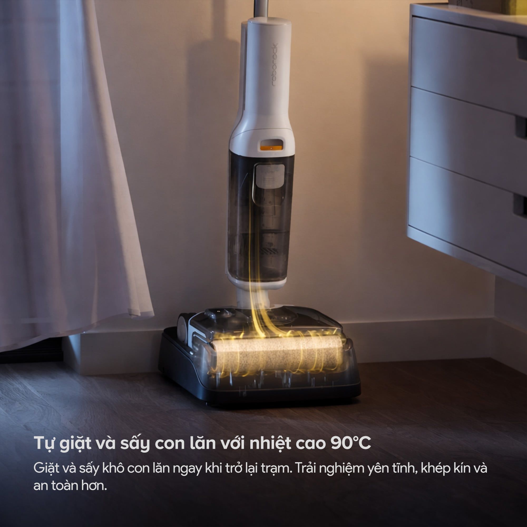 Vệ sinh sau khi sử dụng là khâu quan trọng để duy trì hiệu suất thiết bị lâu dài. Roborock F25 RT Gen 2 tích hợp tính năng tự giặt và sấy khô con lăn ngay khi trở lại trạm sạc. Hệ thống sử dụng nhiệt độ cao lên đến 90°C để vừa làm sạch vừa diệt khuẩn toàn bộ bề mặt con lăn. Người dùng có thể lựa chọn giữa hai chế độ sấy: sấy nhanh trong 5 phút hoặc sấy êm ái trong 22 phút, tùy theo nhu cầu và mức độ tiếng ồn chấp nhận được. Toàn bộ quy trình giặt và sấy diễn ra yên tĩnh, khép kín và an toàn, không yêu cầu sự can thiệp thủ công của người dùng.