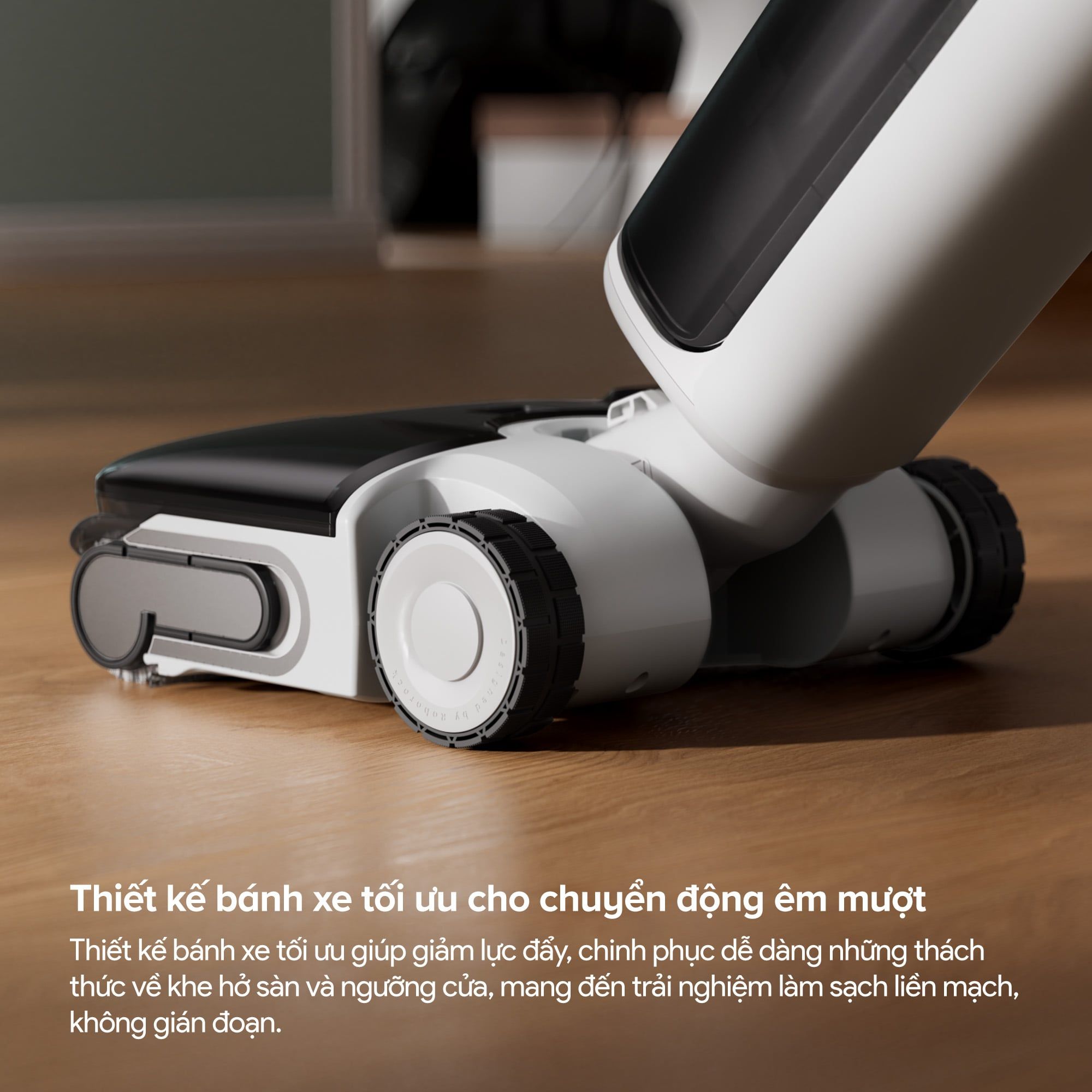 F25 RT Gen 2 được trang bị hệ thống bánh xe với thiết kế tối ưu giúp giảm lực đẩy khi di chuyển. Bánh xe của Roborock F25 RT Gen 2 được cấu tạo đặc biệt để dễ dàng chinh phục các thách thức về khe hở sàn và ngưỡng cửa – những vị trí thường gây vướng víu cho các thiết bị làm sạch thông thường. Thiết kế này mang lại trải nghiệm làm sạch liên mạch, không bị gián đoạn, cho phép người dùng di chuyển thiết bị từ phòng này sang phòng khác hoặc qua các bậc thềm nhỏ một cách trơn tru và tự nhiên.