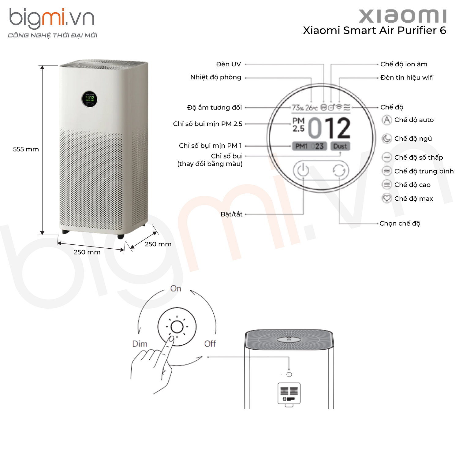 Máy lọc không khí Xiaomi Mijia Smart Air Purifier 6 thông minh là giải pháp bảo vệ nguồn không khí mà bạn hít thở một cách toàn diện. Thiết bị được trang bị hệ thống 5 cảm biến chuyên dụng, màn hình màu LCD trực quan và mô-đun khử trùng tia UVC tích hợp, đảm bảo không khí trong nhà luôn sạch sẽ và an toàn. Bên cạnh đó, máy cũng được thiết kế nhỏ gọn, sử dụng các loại vật liệu cao cấp và đạt hiệu suất lọc vượt trội giúp Máy lọc không khí Xiaomi Mijia Smart Air Purifier 6 trở thành lựa chọn lý tưởng cho mọi gia đình. Xiaomi Mijia Smart Air Purifier 6 không chỉ loại bỏ đến 99,98% bụi mịn PM2.5 mà còn kiểm soát nhanh các chỉ số PM1, nhiệt độ và độ ẩm theo thời gian thực. Máy có tốc độ lọc đạt CADR hạt vượt trội, lên đến 443m³/giờ, nhờ đó Mijia Air Purifier 6 có thể làm sạch toàn bộ căn phòng 30m² chỉ trong 3,5 phút. Với khả năng lọc sạch vượt trội, thiết kế thông minh và vận hành êm ái, sản phẩm Máy lọc không khí Xiaomi Mijia Smart Air Purifier 6 cam kết mang đến một môi trường sống trong lành, an toàn và tinh khiết, nơi mỗi hơi thở đều là sự an tâm.