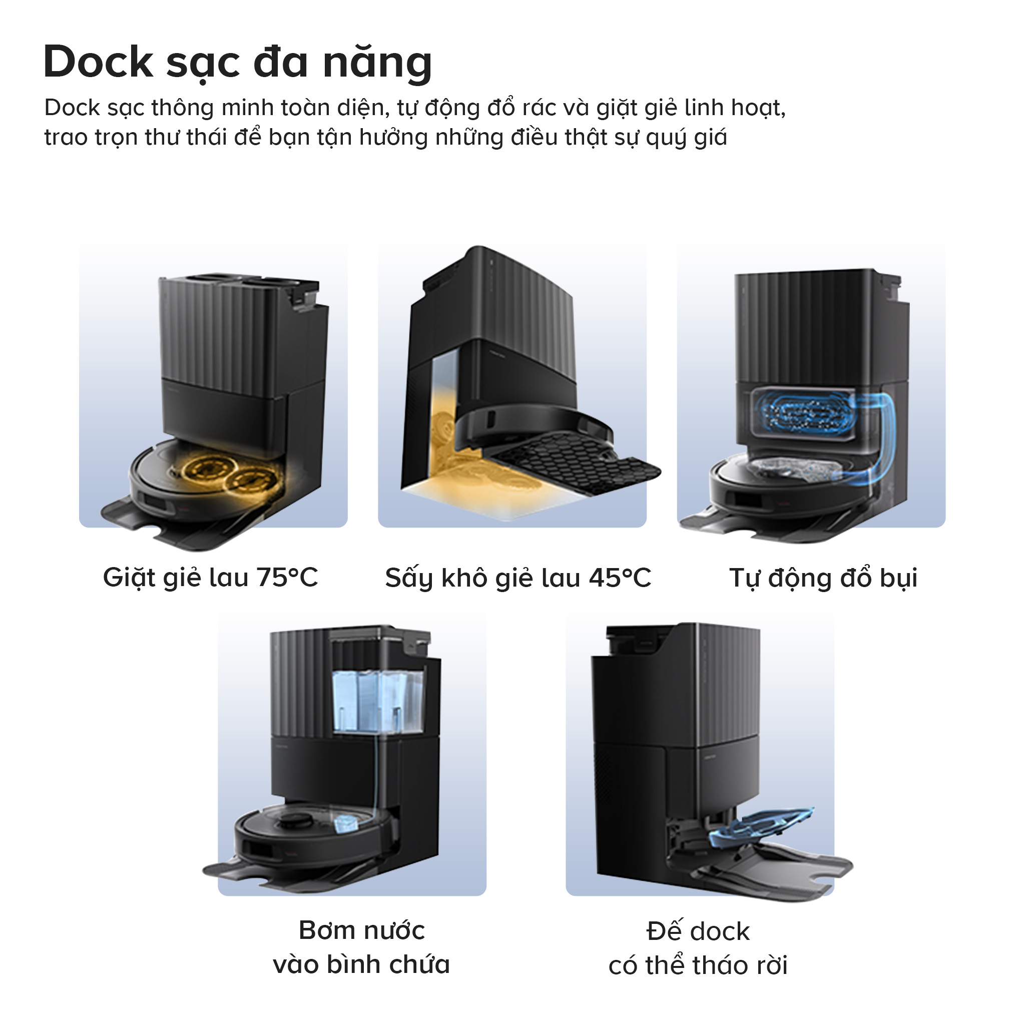 Trạm dock của Roborock Qrevo S Pro có kích thước 450 x 450 x 450mm, là trung tâm vận hành toàn bộ quy trình vệ sinh tự động. Sau mỗi chu kỳ làm việc, robot tự động quay về dock và kích hoạt hàng loạt tác vụ: giặt giẻ lau bằng nước nóng đạt 75°C để loại bỏ vi khuẩn và vết bẩn bám dai, sấy khô giẻ ở nhiệt độ 45°C bằng luồng khí ấm để ngăn ẩm mốc và mùi hôi, đồng thời tự hút toàn bộ bụi bẩn trong hộc chứa robot vào túi bụi kín bên trong trạm. Hệ thống bình chứa nước sạch và bình thu hồi nước bẩn tích hợp trong dock có dung tích đủ lớn để giảm đáng kể tần suất người dùng cần thay nước hay vệ sinh định kỳ, cho phép Qrevo S Pro vận hành liên tục trong nhiều ngày mà hầu như không cần thao tác thủ công.