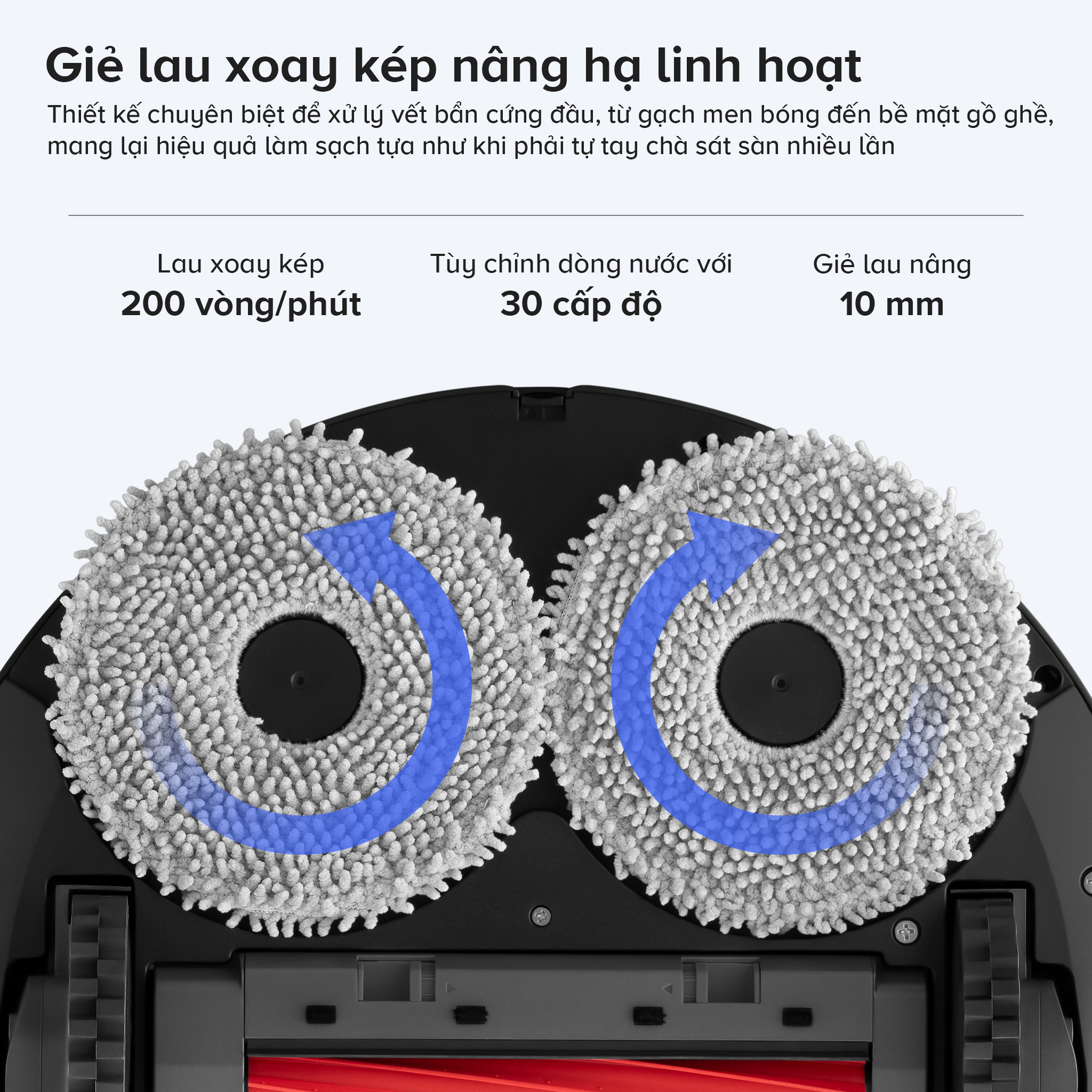 Roborock Qrevo S Pro ứng dụng hệ thống lau kép với hai giẻ lau tròn xoay độc lập đạt tốc độ 200 vòng/phút, mô phỏng chính xác động tác lau tay theo chuyển động xoay tròn. Tốc độ 200 vòng/phút tạo ra lực ma sát đủ mạnh để đánh bật các vết bẩn khô cứng, vết dầu mỡ và cặn bám trên sàn gạch và sàn đá – hiệu quả vượt trội so với phương pháp giặt rung hoặc giẻ lau cố định truyền thống. Hai giẻ lau hoạt động đồng thời và phối hợp với nhau để phủ đều toàn bộ diện tích bề mặt dưới thân robot Qrevo S Pro, không để lại vùng khô hay vệt bẩn chưa được xử lý trong mỗi lần đi qua.