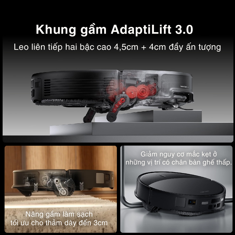 Một trong những rào cản lớn nhất của các dòng robot hút bụi truyền thống là khả năng vượt qua các chướng ngại vật vật lý như ngưỡng cửa hay gờ phân cách giữa các phòng. Robot hút bụi lau nhà Roborock Saros 20 giải quyết triệt để vấn đề này bằng hệ thống AdaptiLift™ Chassis 3.0. Đây không chỉ là một nâng cấp nhỏ, mà là một sự thay đổi toàn diện về cấu trúc cơ khí. Hệ thống khung gầm này hoạt động dựa trên cơ chế nâng hạ tự động khí động học phức tạp. Khi các cảm biến phát hiện ra sự thay đổi về độ cao của mặt sàn hoặc vật cản phía trước, Saros 20 sẽ kích hoạt hệ thống đẩy, cho phép nâng toàn bộ thân máy và bánh xe lên cao. Theo thông số kỹ thuật, robot có thể vượt qua các ngưỡng cửa hoặc bậc cao tới 4,5 cm, và khi kết hợp với khả năng nâng bánh xe, tổng độ cao mà robot có thể xử lý lên tới khoảng 8,5 cm (4,5 cm + 4 cm). Cơ chế này đảm bảo rằng Roborock Saros 20 duy trì được sự liên tục trong quá trình làm sạch. Robot sẽ không còn bị kẹt lại ở những khu vực chuyển tiếp giữa sàn gỗ và sàn gạch, hoặc các thanh nẹp cửa dày vốn là “kẻ thù” của robot thế hệ cũ. Khả năng thích ứng địa hình này giúp tối ưu hóa quy trình làm sạch toàn diện, đảm bảo robot có thể tự do di chuyển từ phòng khách sang phòng ngủ hay nhà bếp mà không cần sự can thiệp của con người.