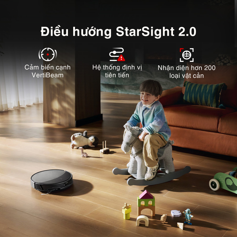 Sự thông minh của Saros 20 được điều phối bởi “bộ não” trung tâm mang tên StarSight™ Autonomous System 2.0. Khác với các hệ thống điều hướng bằng laser (LDS) truyền thống thường yêu cầu một tháp pháo nhô lên trên đỉnh máy, công nghệ StarSight™ trên Robot hút bụi lau nhà Roborock Saros 20 sử dụng hệ thống cảm biến thể rắn (Solid-state) tích hợp chìm vào thân máy. Hệ thống StarSight™ 2.0 cung cấp khả năng lập bản đồ 3D với độ phân giải cao và tốc độ xử lý dữ liệu cực nhanh. Ngay trong lần chạy đầu tiên, Roborock Saros 20 có thể quét toàn bộ không gian, nhận diện cấu trúc phòng, vị trí đồ đạc và thiết lập lộ trình làm sạch tối ưu nhất. Công nghệ này giúp robot nhận biết chính xác vị trí của nó trong thời gian thực với sai số cực thấp. Đặc biệt, khả năng nhận diện vật cản của StarSight™ 2.0 đạt độ tin cậy rất cao. Robot có thể phân biệt được các vật thể nhỏ trên sàn nhà như giày dép, dây điện hay đồ chơi trẻ em để chủ động né tránh, giảm thiểu tối đa nguy cơ va chạm hoặc mắc kẹt. Sự chính xác trong điều hướng giúp Saros 20 hoạt động hiệu quả ngay cả trong những môi trường thiếu sáng hoặc có kết cấu nội thất phức tạp, đảm bảo không bỏ sót bất kỳ khu vực nào cần làm sạch.