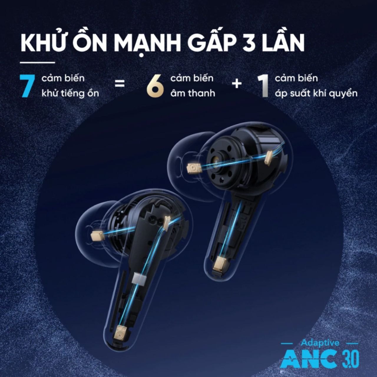Một trong những nâng cấp đáng giá nhất trên Liberty 4 Pro là công nghệ chống ồn chủ động thích ứng ANC 3.0 (Adaptive Noise Cancelling). Khác với công nghệ chống ồn thụ động hoặc cố định, ANC 3.0 sử dụng hệ thống 6 micro và một cảm biến áp suất khí quyển để liên tục giám sát môi trường xung quanh. Thuật toán AI trên Soundcore Liberty 4 Pro sẽ phân tích mức độ ồn và tự động điều chỉnh đường cong giảm tiếng ồn theo thời gian thực cứ mỗi 0.3 giây. Dù người dùng đang ở trên máy bay, trong quán cà phê hay đang đi bộ ngoài đường phố, tai nghe sẽ tự động tối ưu hóa mức độ chống ồn để mang lại không gian yên tĩnh tuyệt đối mà không gây ra cảm giác bí bách hay áp lực lên màng nhĩ.